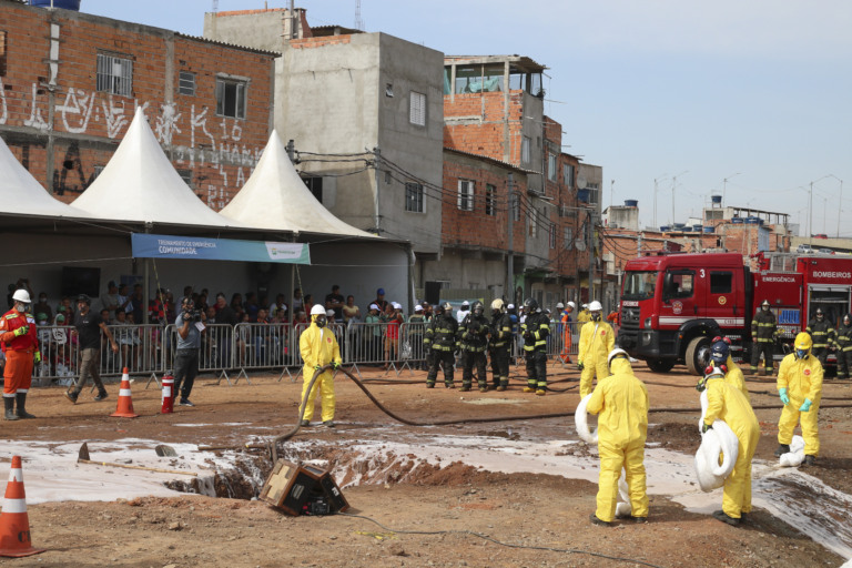 Treinamento da Transpetro, com participação do Corpo de Bombeiros, Defesa Civil e outras instituições, simula vazamento de diesel causado por tentativa de furto em duto de combustível na comunidade Jardim Nair, na Zona Leste de São Paulo. Foto: Rovena Rosa/Agência Brasil
