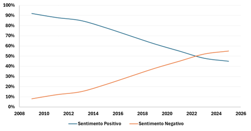 Essa transição de uma pauta baseada em benefícios para uma dominada por conflitos é alarmante. Em 2009, o sentimento era 90% positivo, impulsionado pela expectativa de empregos e renda. Gradualmente, essa percepção converteu-se em frustração.