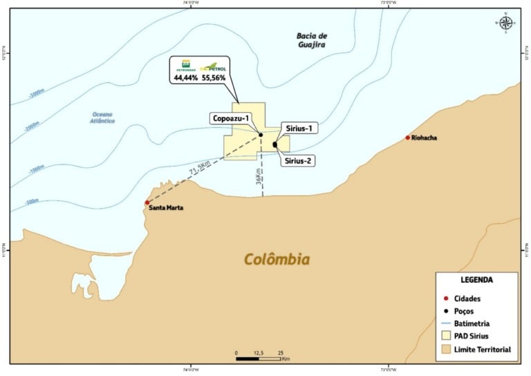 Copoazu-1 encontra-se a 36 km da costa, a uma lâmina d’água de 964 metros e a uma distância de 8 km dos poços Sirius-1 (descobridor) e Sirius-2 (de avaliação) — onde já foram confirmados volumes superiores a 6 trilhões de pés cúbicos (TCF) in place.