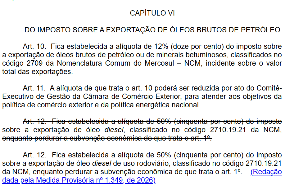 - Art. 10. Fica instituída a alíquota do Imposto de Exportação incidente sobre as operações de exportação de óleo bruto de petróleo ou de minerais betuminosos, classificados no código 2709 da Nomenclatura Comum do Mercosul – NCM, fixada em 12% (doze por cento).